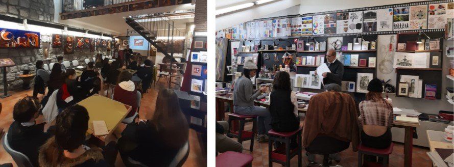 Momenti della lezione dove i ragazzi, liberamente seduti attorno ai tavoli, hanno potuto assistere al percorso storico che ha condotto alla nascita del Bauhaus di Weimar. La seconda lezione che si è svolta al piano di sopra ha rappresentato il momento della messa in pratica degli insegnamenti della mattinata. I ragazzi hanno potuto visionare tutti i processi che conducono alla realizzazione dell'oggetto libro. E' stato proposta loro la possibilità di allestire interamente il manuale "Colore forma e visione" che hanno consultato durante la lezione.